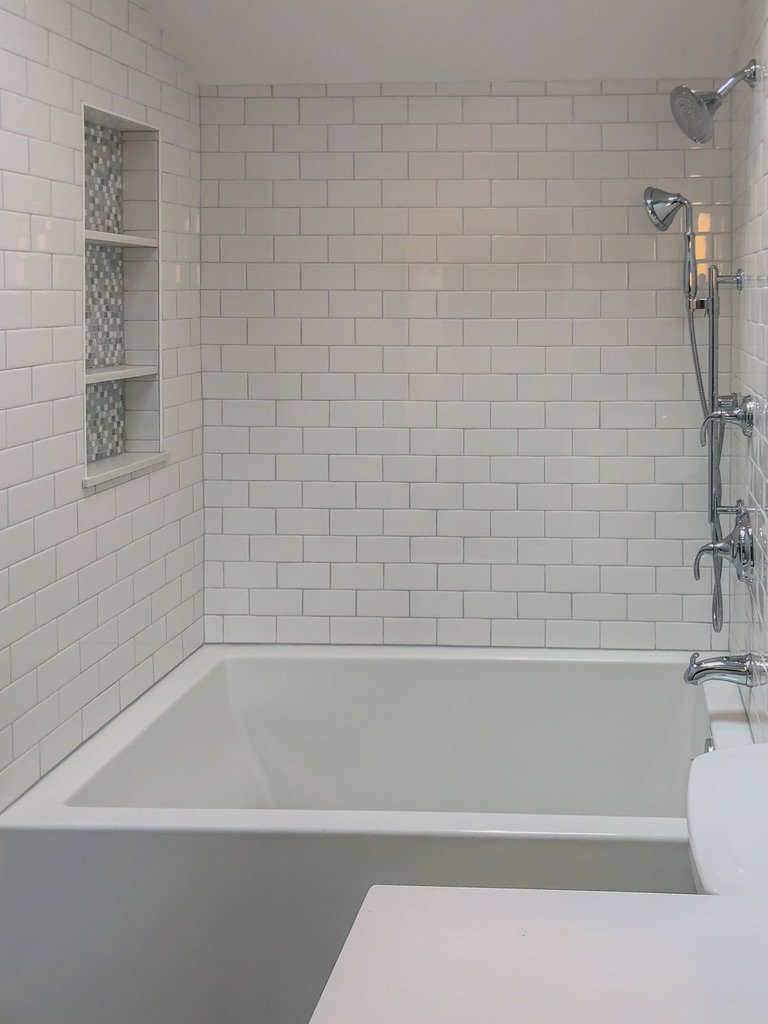 A complete waterproofing system was installed to ensure long-term protection and performance behind the tile. The shower area features classic subway tile, custom recessed niches, and a clean layout designed for everyday use and easy maintenance.