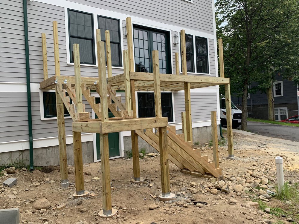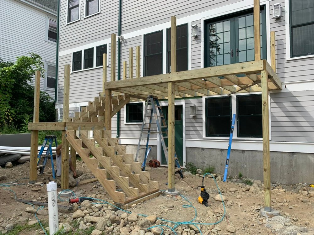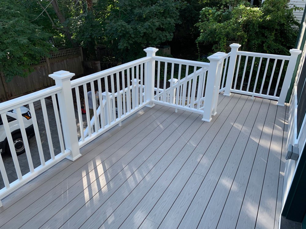 This Belmont deck project highlights the full build process from structural framing to finished outdoor living space. Designed for durability and everyday use, the deck features pressure-treated framing, composite decking, and clean white railings for a timeless look.