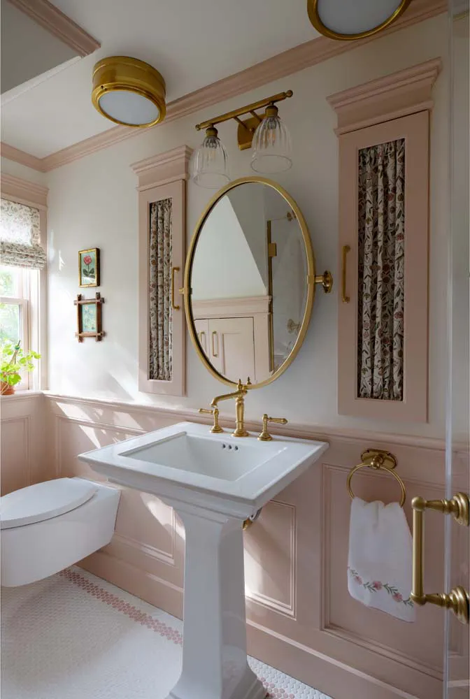 One space embraces soft pink tones, creating a light, warm, and inviting atmosphere through delicate tilework and subtle textures. The other explores deep blue hues, offering a richer, more immersive sense of depth and sophistication.