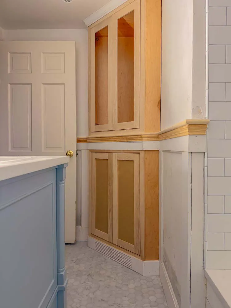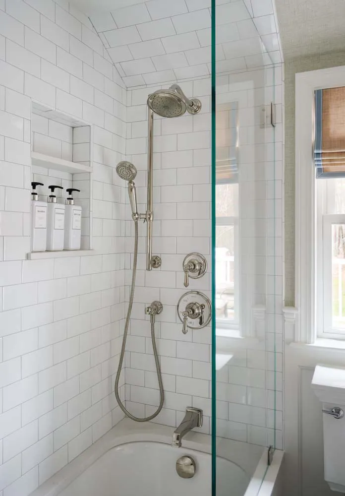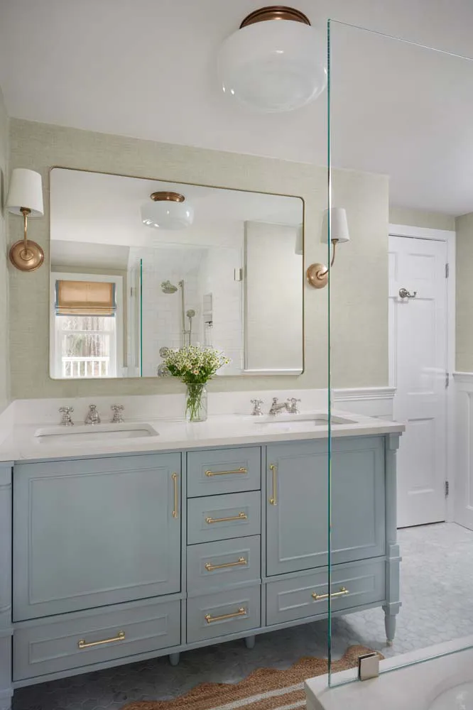 This Sherborn bathroom remodel was designed to elevate both function and everyday experience. The space features a custom double vanity, warm brass fixtures, and a frameless glass shower enclosure that keeps the layout open and refined.